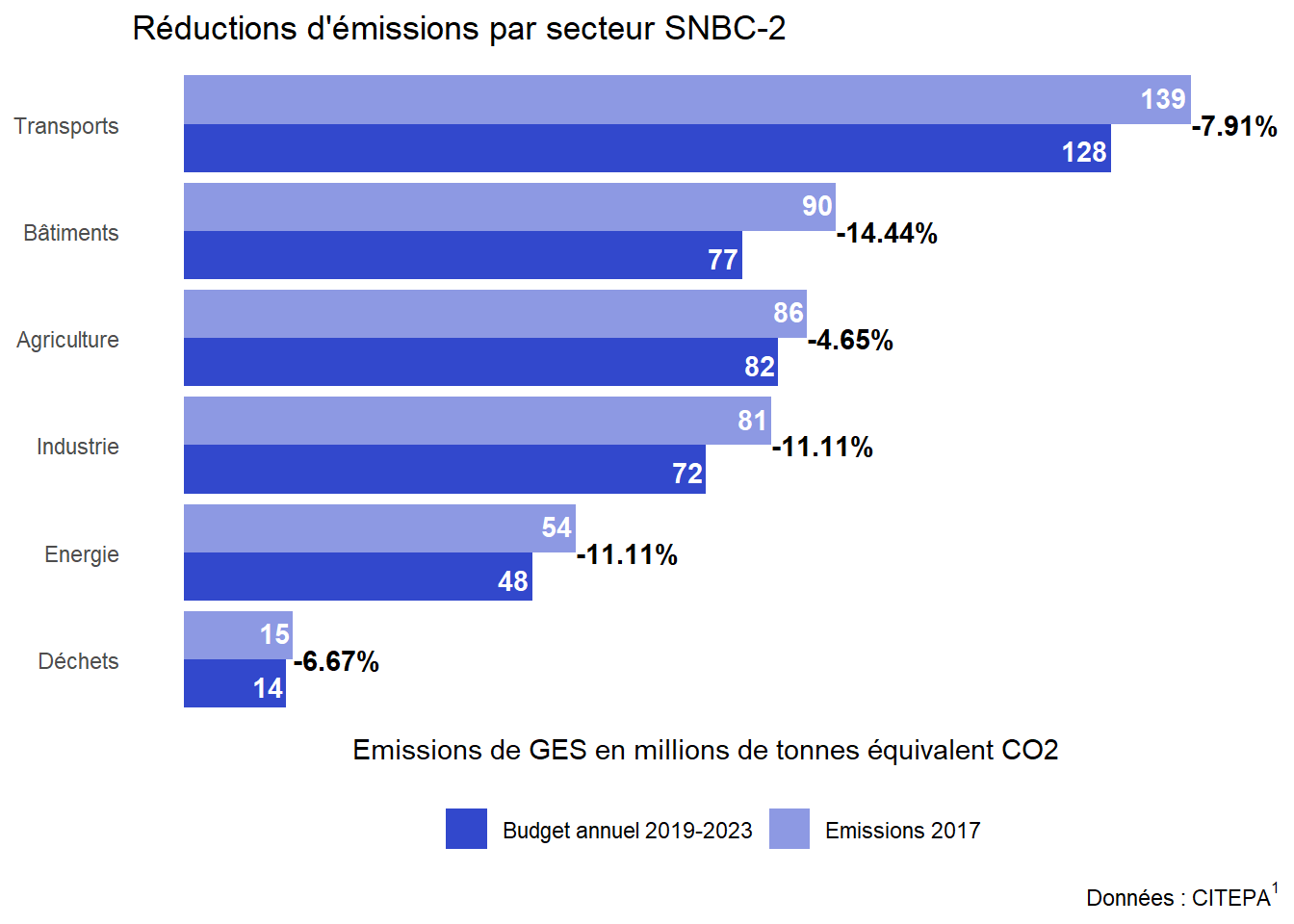 La SNBC-2 inscrit, à titre indicatif, des objectifs de réduction des émissions par secteur. S’ils ne sont pas contraignants, ils permettent de mieux planifier les réductions d’émissions.