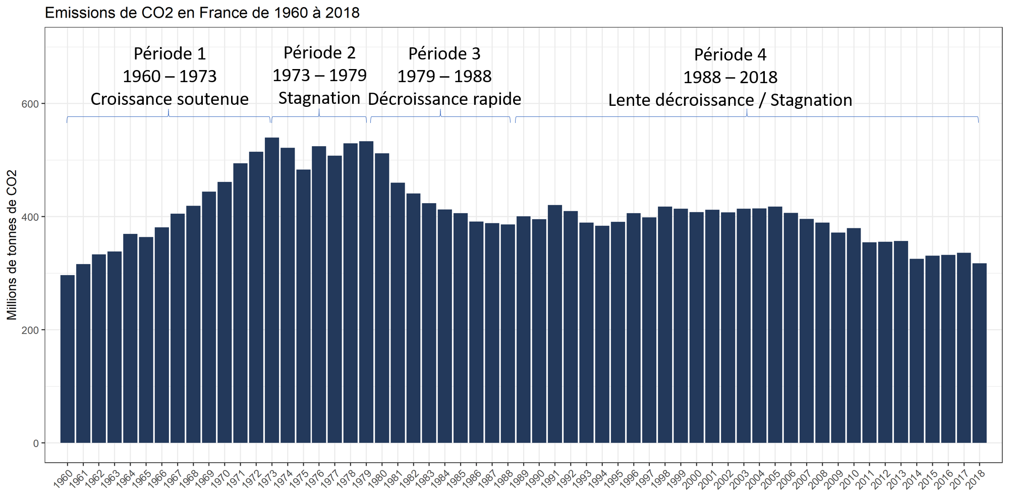 Pour commencer, jetons un coup d’œil à l’évolution des émissions de dioxyde de carbone en France.