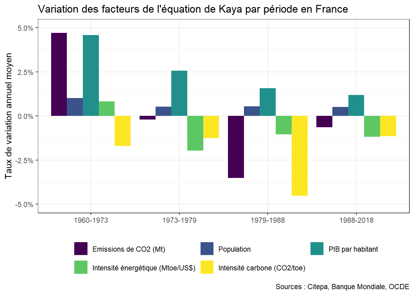 Le tableau et le graphique ci-dessus présentent le taux de croissance annuel moyen des différents éléments de l’équation de Kaya sur chacune des périodes définies.