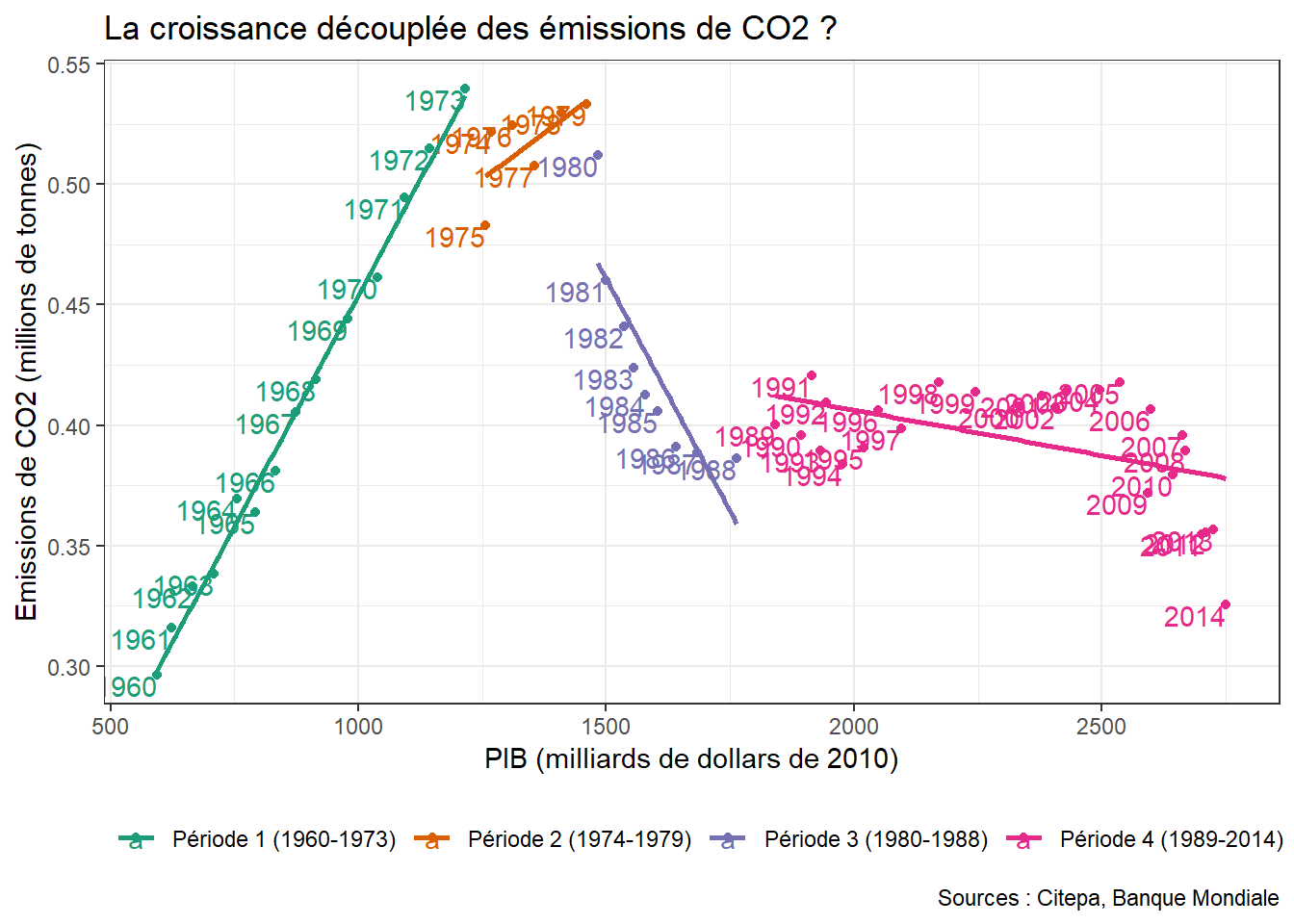 On observe que la France est passée par un pic d’émissions de CO2 en 1973. À partir de cette période, on observe un découplement de la croissance de la richesse par habitant et des émissions de CO2. Cela signifie que les émissions de dioxyde de carbone nationales ont cessé d’augmenter avec la croissance.